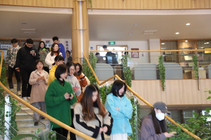 下午13:30,保卫处老师准时在图书馆四楼党史教育中心施放烟雾并吹哨示警,图书馆员迅速关闭电梯,打开安全通道,引导学生快速、有序地从安全楼梯撤离图书馆。在全体在馆师生的配合下,所有在馆人员在5分钟之内全部完成撤离。